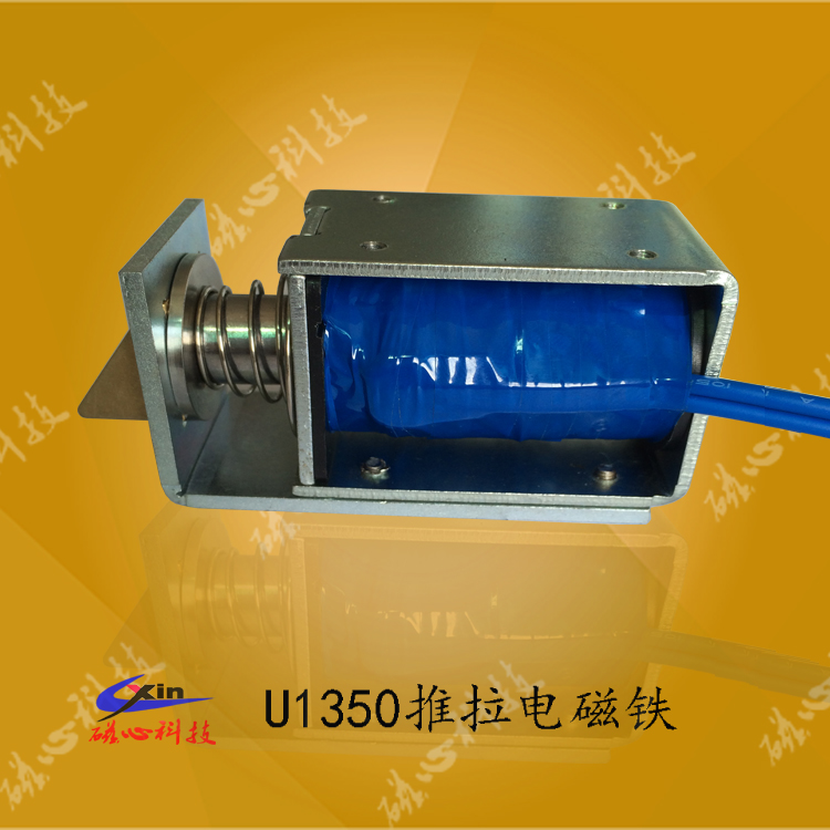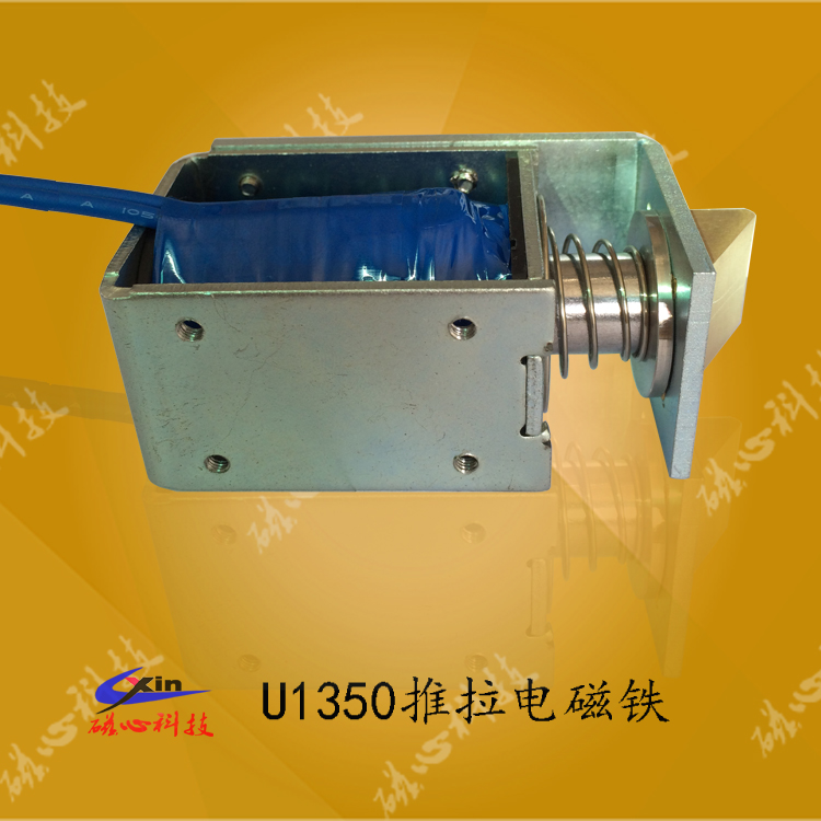是由框架式電磁鐵U1350為主體,另外加裝安裝支架和鎖石以及復(fù)位彈簧等部件組成的一個(gè)門鎖電磁鐵