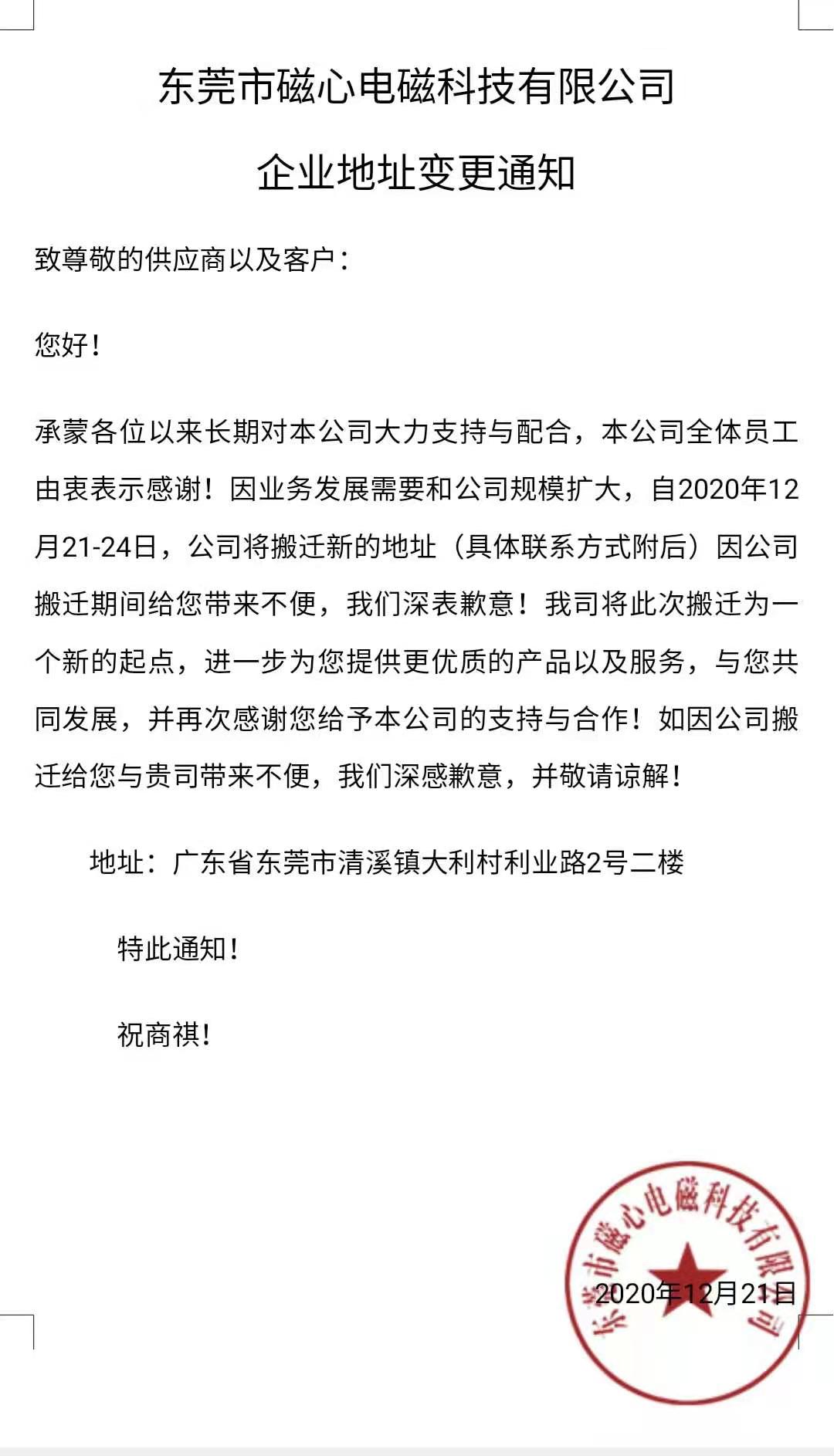 東莞市磁心電磁科技有限公司搬遷公告